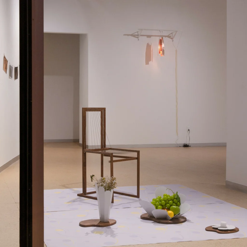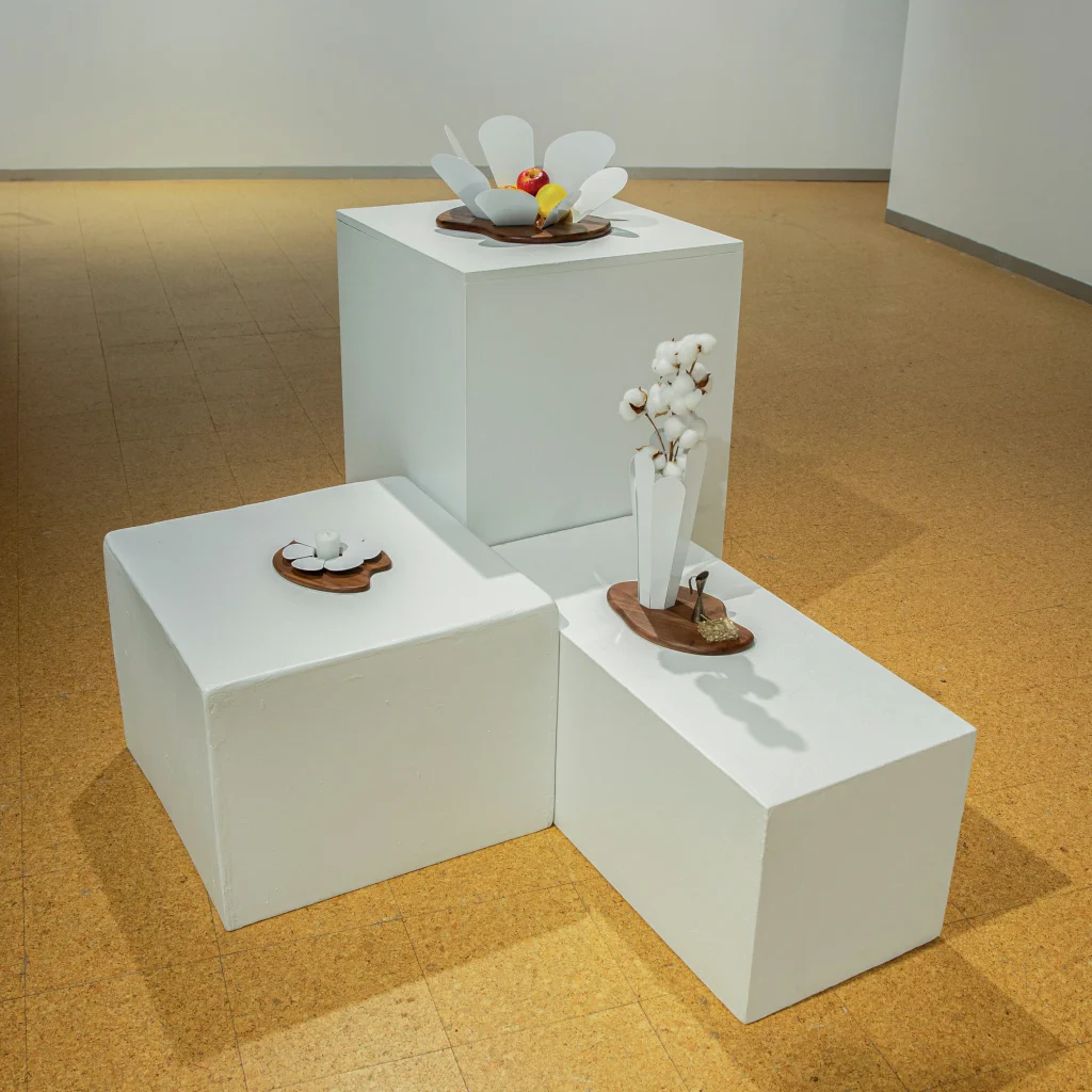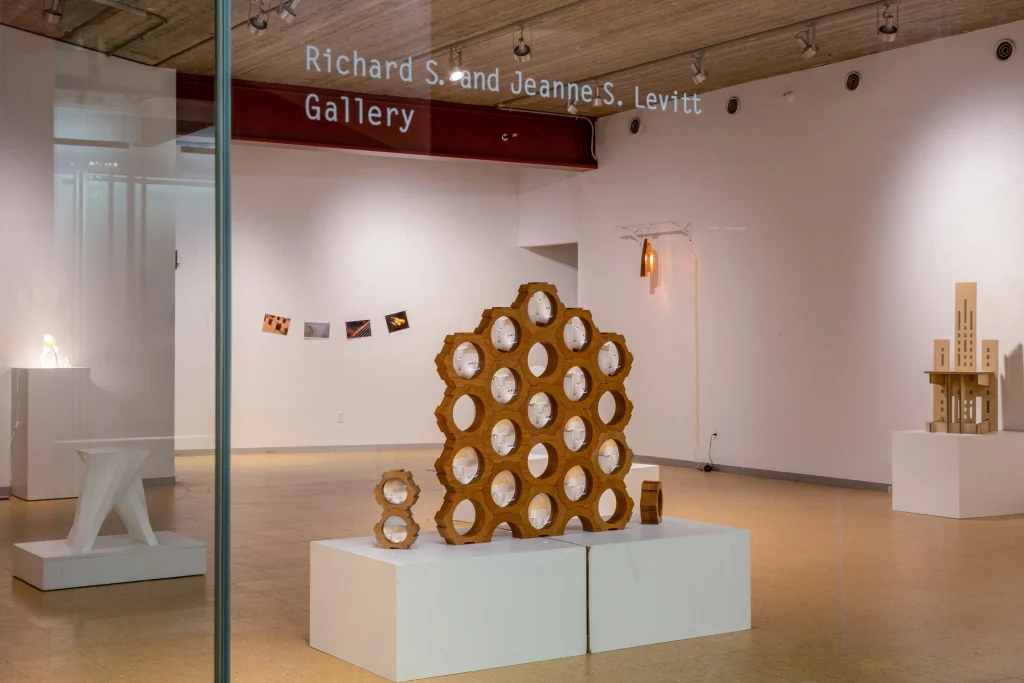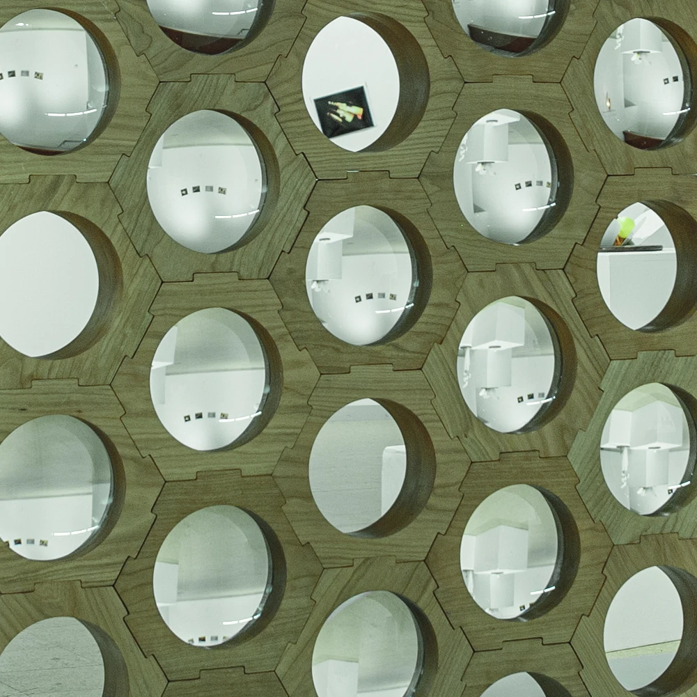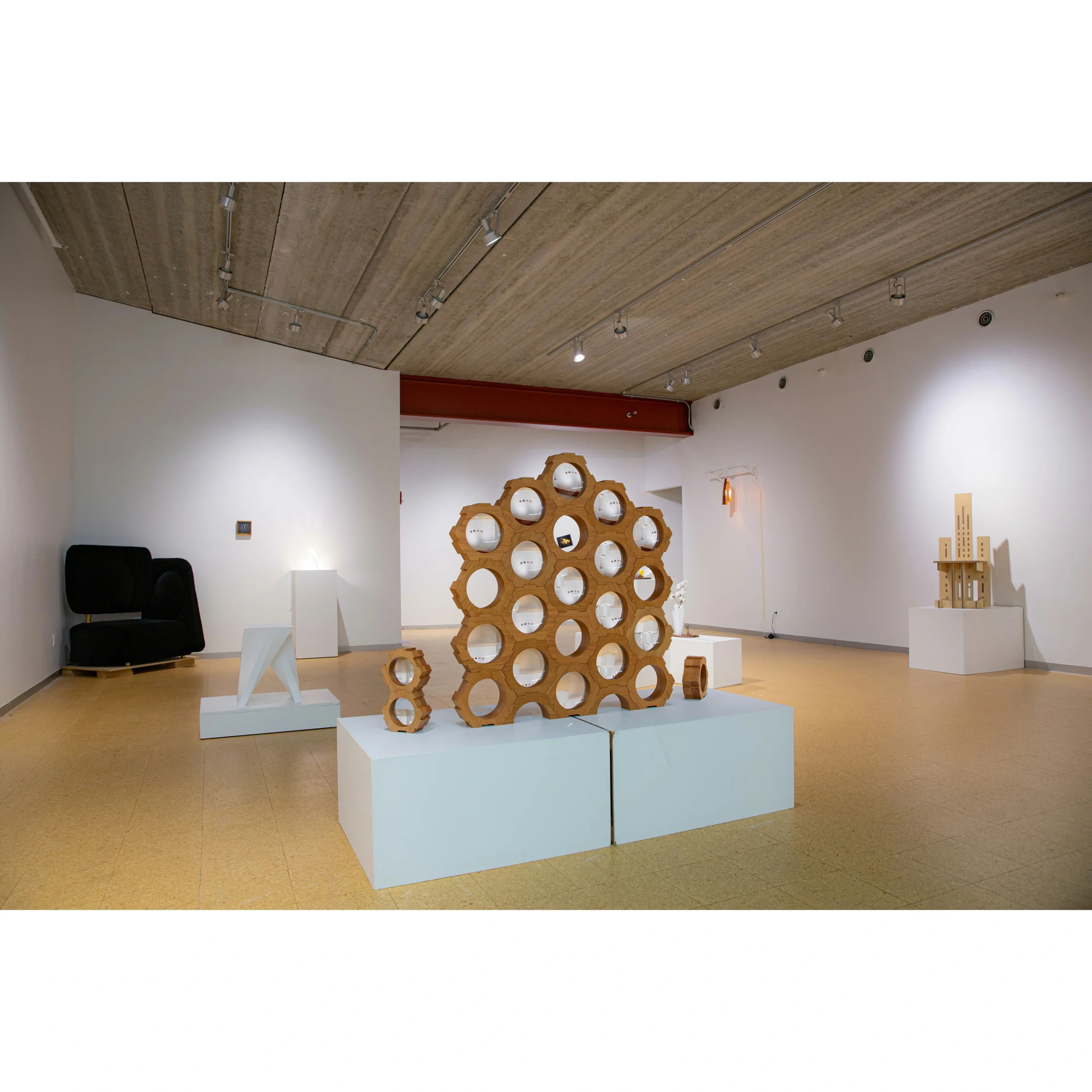 The thesis exhibition, held in the Levitt Gallery of The University of Iowa, presents twelve design works across a wide range of scales—from salt and pepper dispensers to large installations—to illustrate the thesis interpretation of design practice as incarnation. The thesis work PolyEye Divider is positioned at the entrance to offer a whimsical and inviting prelude to the exhibition. It also serves as a statement piece, demonstrating how an abstract concept—compound vision—can be transformed into material existence.