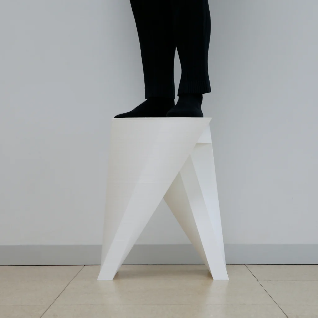 This understanding of Bill’s sculpture inspired me to design the “Paradox Stool,” a sturdy 3D-printed stool with a neat appearance, in which its seat utterly transforms into its feet via a series of apparently insignificant subtle changes.