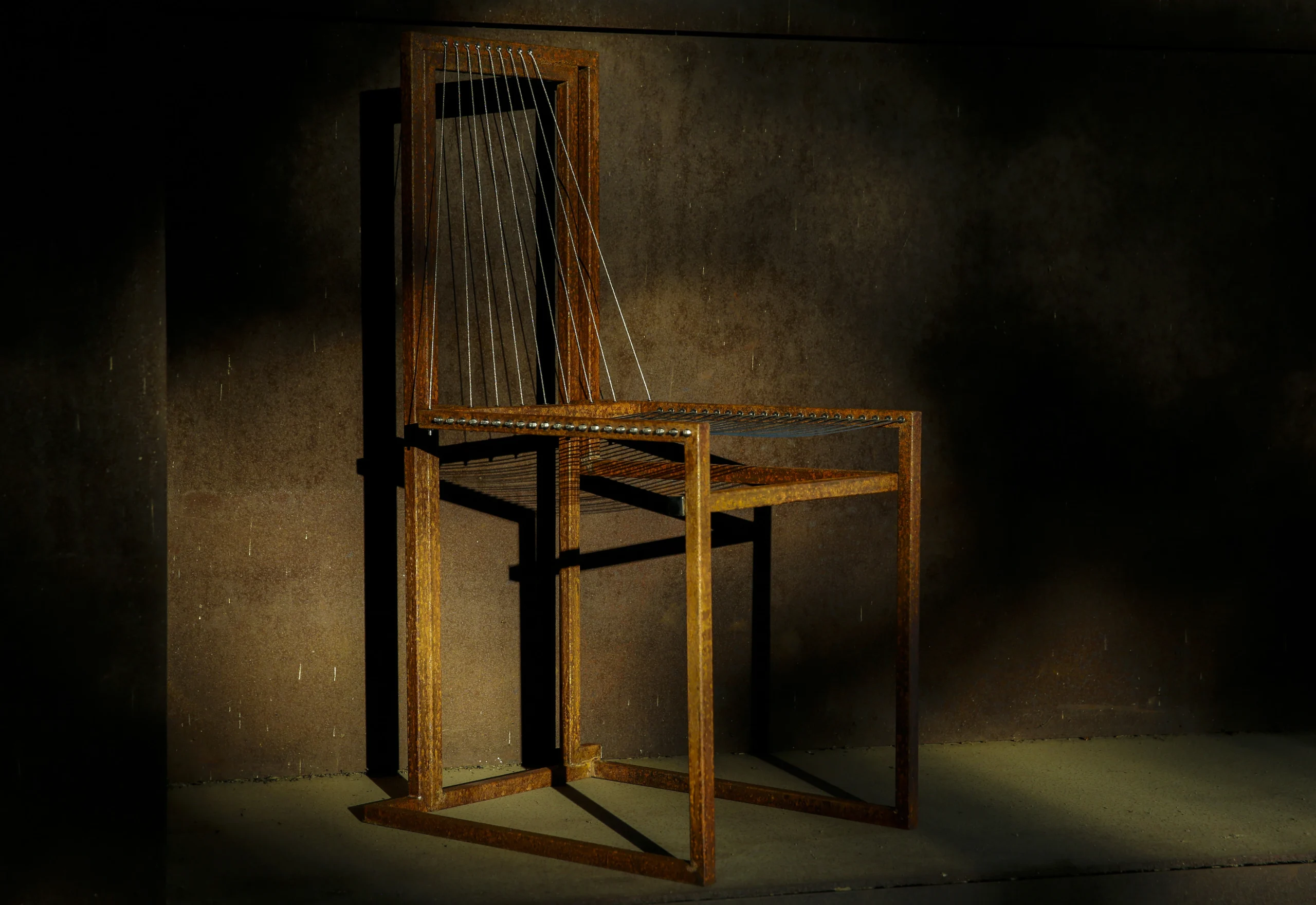 The strength and neatness of wire rope make it a widely used material in architecture. Yet it has rarely been applied in chair design. String Chair explores the potential of wire rope as a material in chair design. Its form is inspired by bridge engineering and the stringing of a violin, while a rust finish gives the surface an antique look. An understated feature of the design is that the frame forms a single continuous line, with only its two ends highlighted by nickel-plated steel caps.