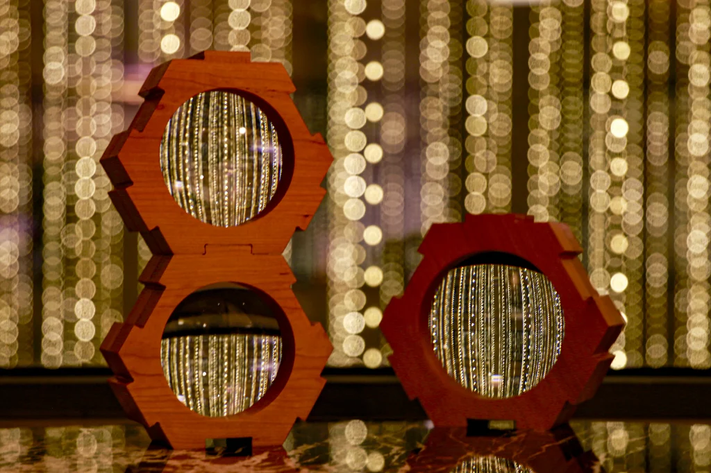 This design was later reimagined on a larger scale to transform it into a spatial divider. To facilitate transportation, the structure was modularized, incorporating a new lens configuration and the use of cherrywood as structural material.