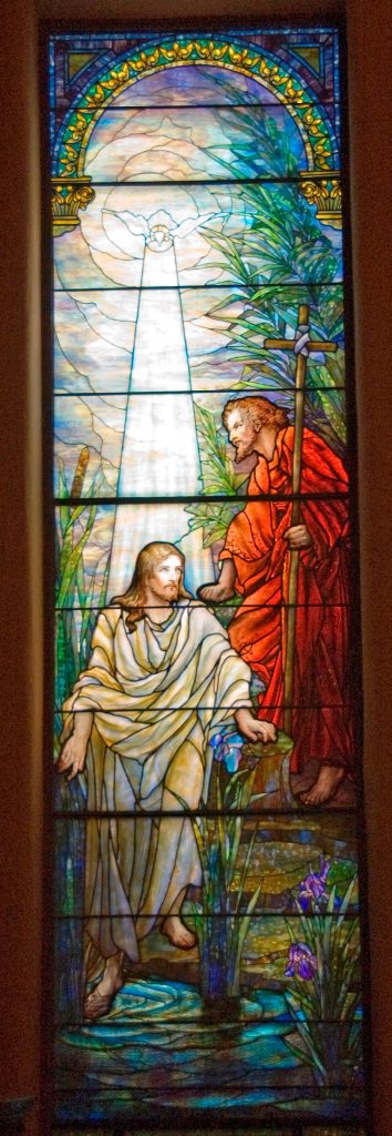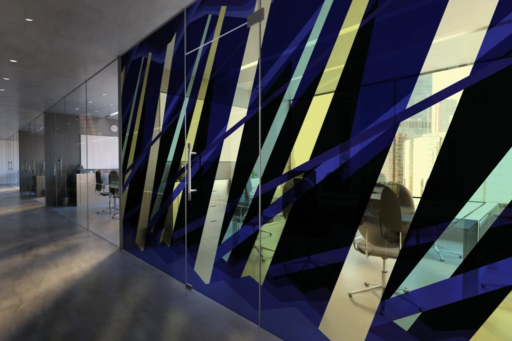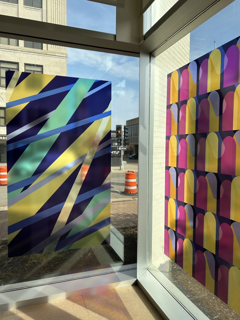 Light Storm, measuring 72” × 42”, is a wallpaper design inspired by a Tiffany Studios stained glass window in St. Luke’s United Methodist Church. The luminous effect of Tiffany glass is evoked through varying shades of elongated stripes and realized with UV print on adhesive vinyl, installed on glass.